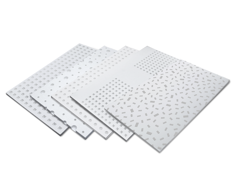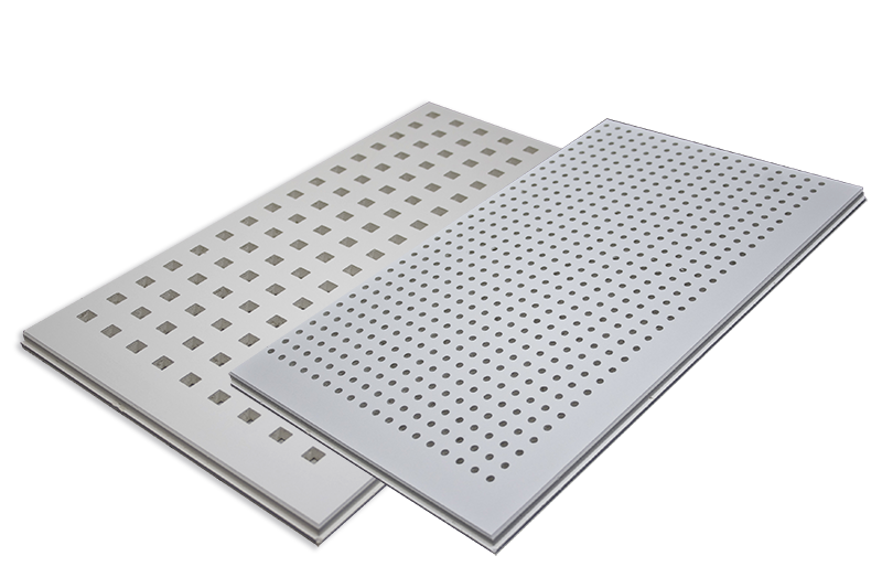 Chapa em Drywall desenvolvida para utilização em sistemas de tetos e revestimentos, é fornecida com furação quadrada, redonda, redonda aleatória, retangular aleatória ou em blocos, promovendo absorção sonora e conforto acústico nos ambientes em que é instalada.
